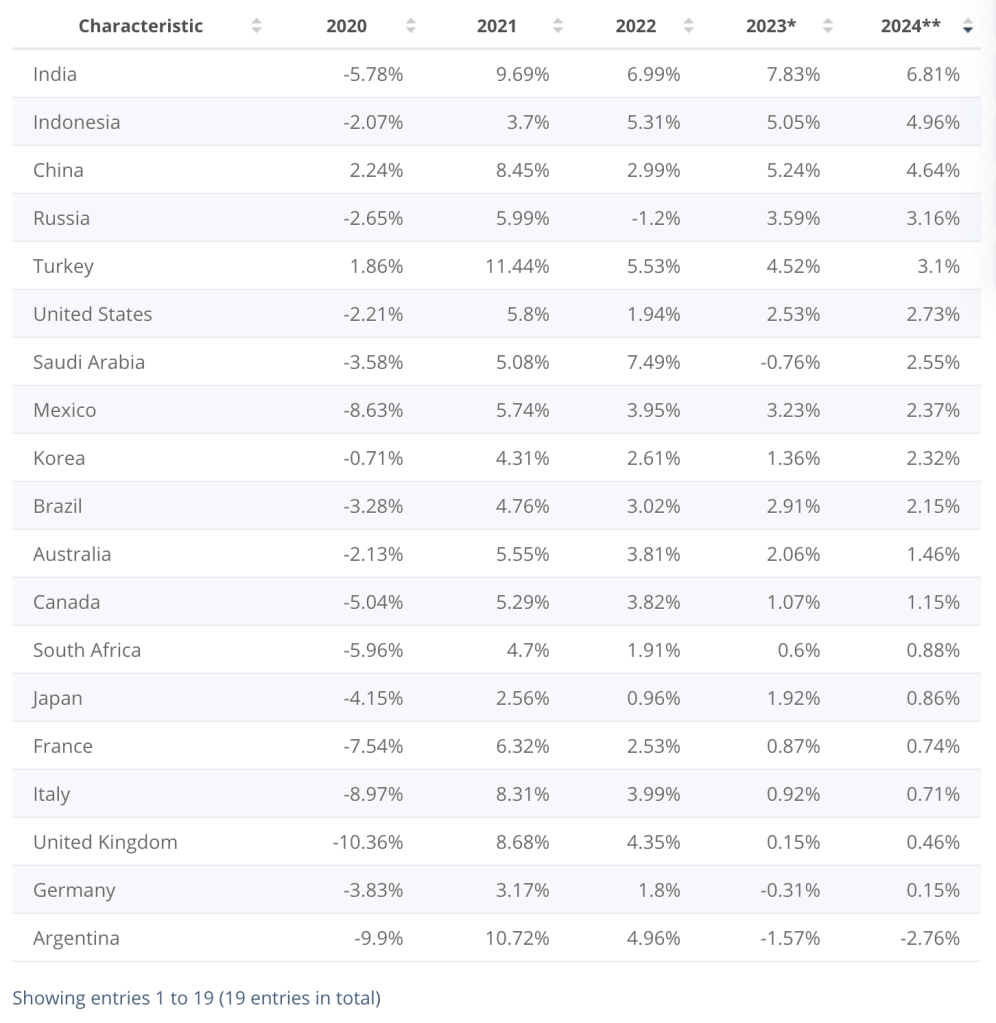 Gross domestic product (GDP) growth of G20 countries from 2020 to 2024, by country (2025). Statista. Available at: https://www.statista.com/statistics/1468449/gdp-growth-g20-countries/ (Accessed 20 January 2025)