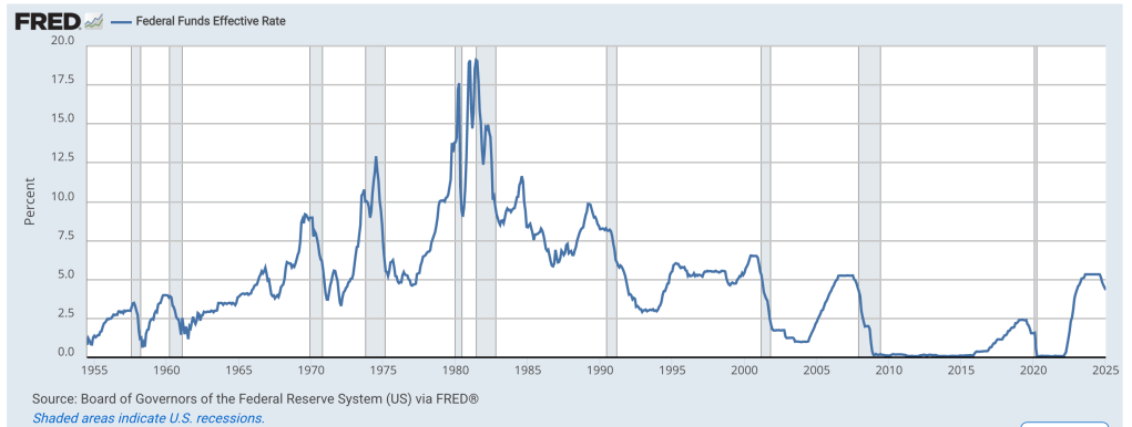 During the covid pandemic most advanced economies loosened their monetary policy by keeping interest rates low and increasing their money supply. This lead to high levels of inflation in the following years, which is the reason most advanced economies are now combating inflation by having high interest rates (Hutchinson, J. and Mee, S., 2025). Let’s have a look at the interest rate development from the US: