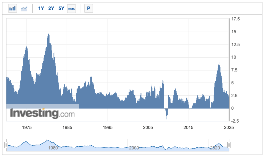 Here we have a look a look at the historical data. Notice how inflation spiked in 2021-2022. This level of inflation is inly comparable to levels of inflation during the 70s, but it has now become again stable at around 3%.