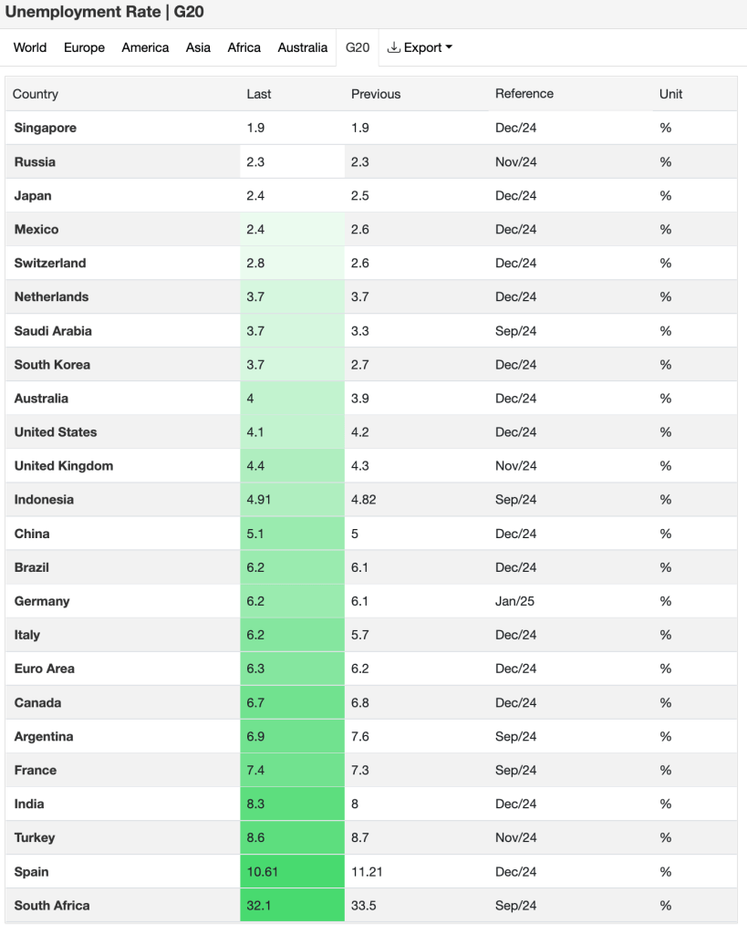 Unemployment rate G20 countries (2025). Trading Economics. Available at: https://tradingeconomics.com/country-list/unemployment-rate?continent=g20 (Accessed 02 February 2025)